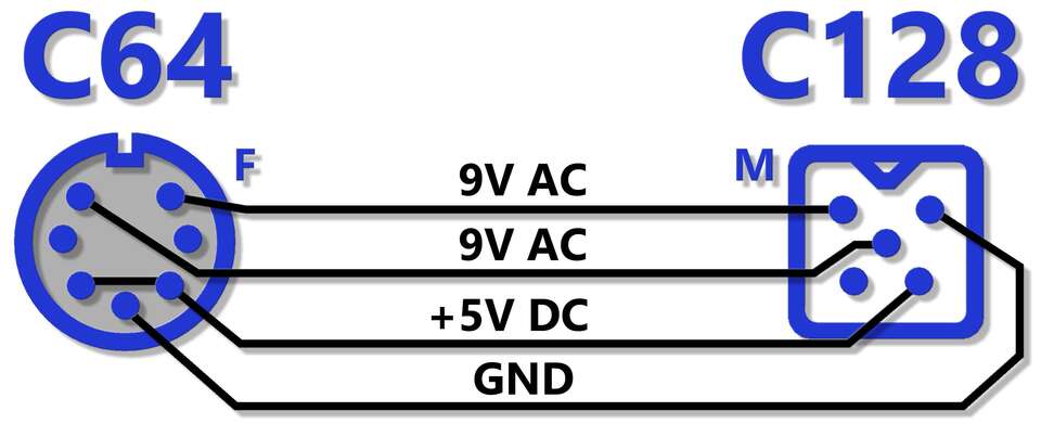 Power adapter converting Commodore 64 DIN7 round plug to Commodore 128 DIN5 square plug. Conveys +5V DC and 9V AC. Matches C64 pinout on one side, and C128 pinout on the second side.