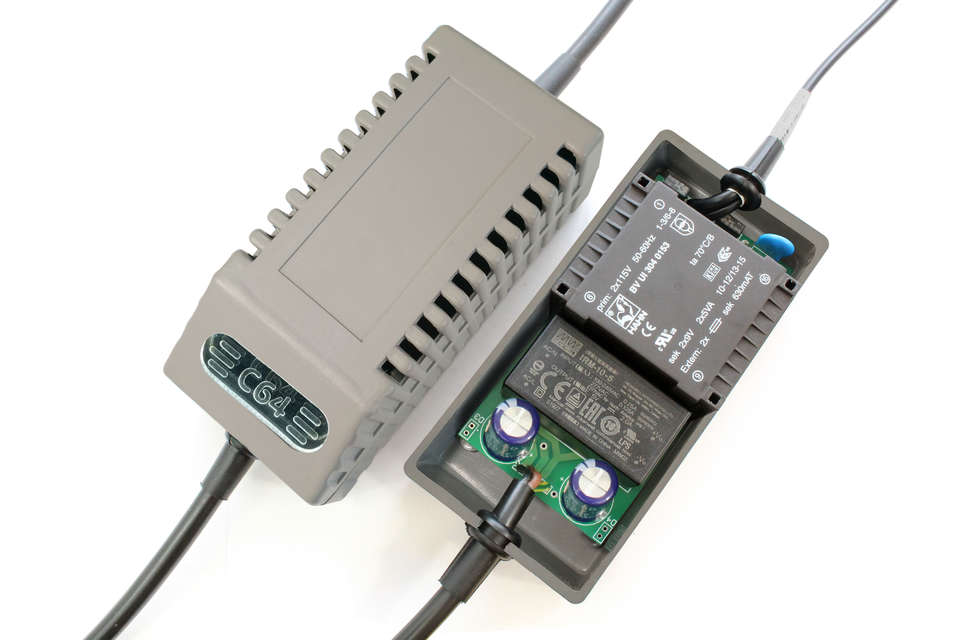 Our C64 PSU is designed to be safe for the user, and safe for the computer. It's protected from over-current and over-voltage, and fused on both the AC and DC sides. Nevertheless, it's mandatory to say that this is a 120/230V AC power device, which should not be opened, tampered with, or used for anything else than powering an unmodified Commodore 64 computer. It's intended for indoor usage only, the maximum rated current should not be exceeded, and proper ventilation should be ensured. For reference, a picture of the opened power supply is shown below.