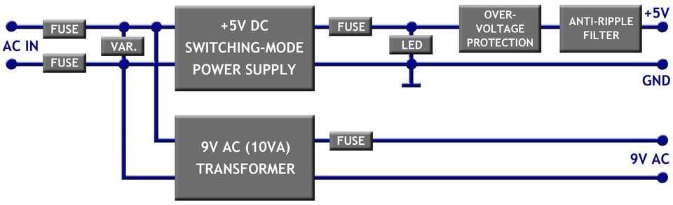 Our C64 PSU is designed to be safe for the user, and safe for the computer. It's protected from over-current and over-voltage, and fused on both the AC and DC sides. Nevertheless, it's mandatory to say that this is a 120/230V AC power device, which should not be opened, tampered with, or used for anything else than powering an unmodified Commodore 64 computer. It's intended for indoor usage only, the maximum rated current should not be exceeded, and proper ventilation should be ensured. For reference, a picture of the opened power supply is shown below.