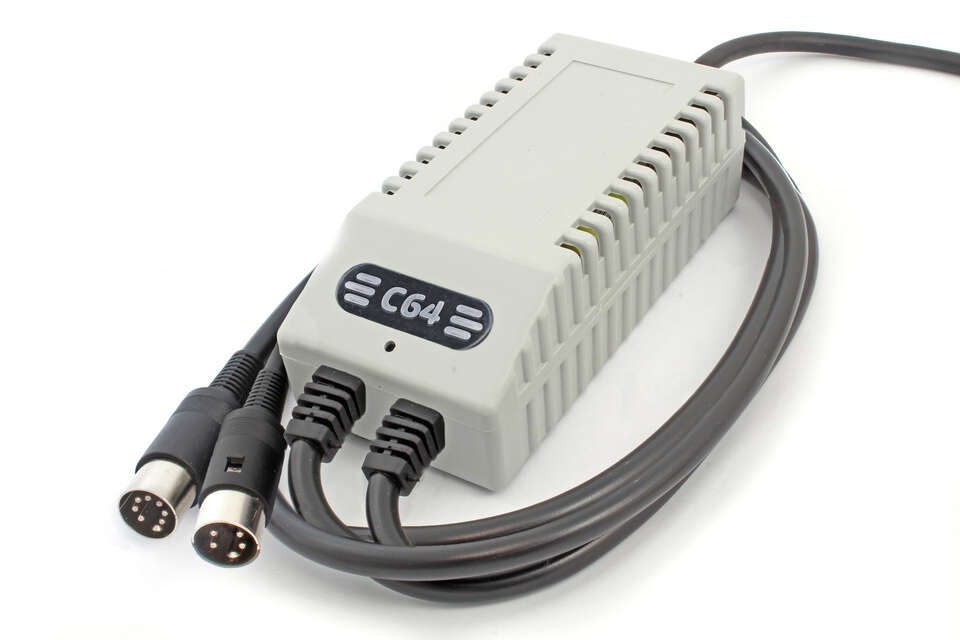 High-quality Commodore 64 replacement power supply unit (PSU) with an additional power output for a floppy disk drive 1541-II/1571-II/1581. Designed specifically for C64 and VIC-20 systems to preserve them in a pristine condition for years to come. Stabilized and filtered +5V/2.0A DC along with 9V/1.1A AC ensure continued error-free operation of your C64. Robust and sturdy chassis with LED-illumination. Fully fused and electrically protected, with round DIN7 plug matching the original C64 PSU pinout. The 1541-II/1571-II/1581 FDD output has a round DIN4 plug and supplies +5V/1.0A and +12V/0.5A DC voltage.