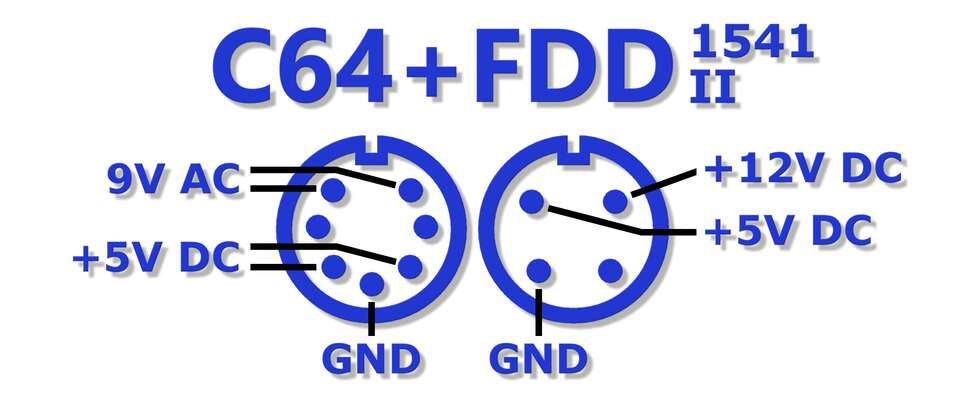 The C64 FDD dual power supply has two power outputs, one for the C64 system, and one for the floppy drive 1541-II/1571-II/1581 unit. The FDD output has a round DIN4 plug and supplies +5V/1.0A and +12V/0.5A DC voltage. The entire system can be power through this single power supply.